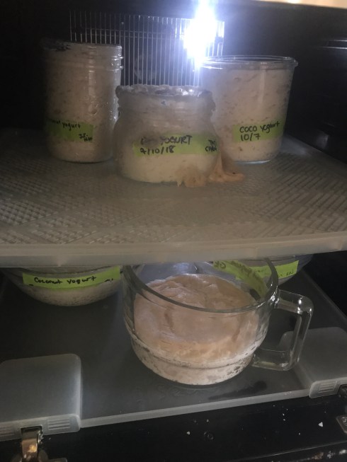 Yesterday we checked on the Yogurt we left dehydrating overnight and they all looked like they overfermented. Ours looked like it had exploded and it fermented way more than all the others. Not sure why.