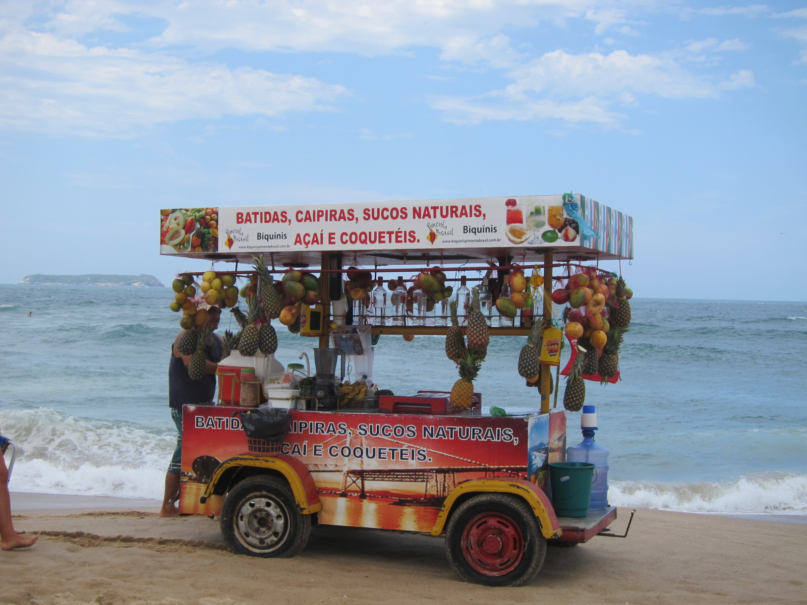 This is a Beverages’ Cart at Jurere Beach in Florianopolis, Brazil. The sign lists what they are selling: Batidas (Alcoholic drink which consists of mashed fresh fruits, condensed milk and ice), Caipiras better known as their diminutive Caipirinhas), Sucos Naturais (fresh fruit juices), Acai, and Cocktails. I almost forgot, they also sell bikinis!