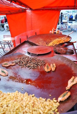 17 OctKauppatori– Ginormous Paella Style Pans, where seafood, rice and vegetables are prepared, at the Street Market in Helsinki, Finland